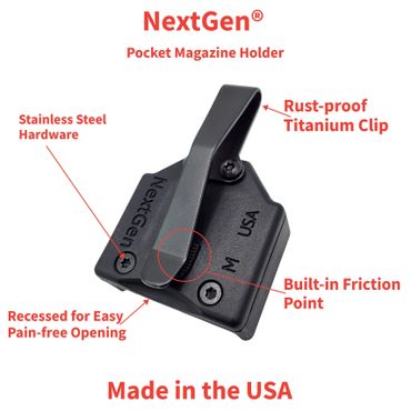 NextGen is superior to traditional steel pocket Magazine clips because of its high strength, low weight polymer construction. This material provides a number of key benefits that steel simply cannot match. For one, our polymer product won't scratch your magazines or rust, ensuring your magazine stays in top condition. Additionally, the lightweight polymer feels better in your pocket, making it more comfortable to carry throughout the day. And when it's time to access your gear, the NextGen clip is designed to be easy to open so It wont hurt your fingers, and allows you to quickly and easily slide it into place. Overall, our polymer product is a superior choice for anyone looking for a reliable, durable, and easy-to-use pocket magazine clip.